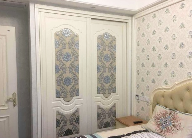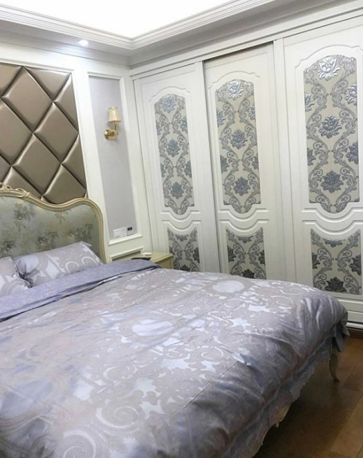 主卧室,床头背景墙做了软包,看起来更加温馨,最喜欢的是衣柜门,上面的图案很漂亮