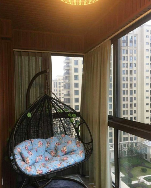 客厅外面的阳台,放了一张吊篮椅,没事的时候可以窝在上面听听音乐、喝喝茶,看看外面的风景,咱也小资一把,哈哈