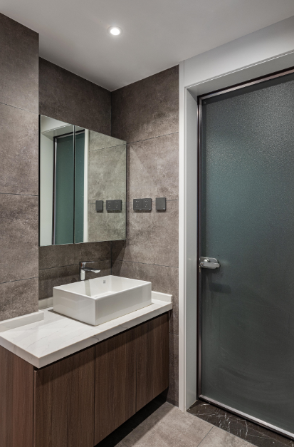 主卫以功能为主,设计悬浮的浴室柜避免受潮。有了镜柜,洗漱台面也能时刻保持简洁干净,还有超好用的电热毛巾架及干湿分离的淋浴间。