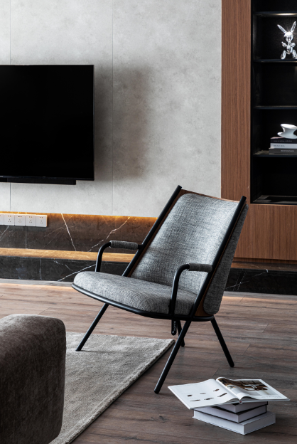 打破常规电视背景墙的设计思路,本案例电视背景墙采用四种材质的碰撞,同时背景墙后的儿童房,让出小部分空间给到过道,使延伸至过道的电视背景墙,也拥有了强大的收纳功能。
