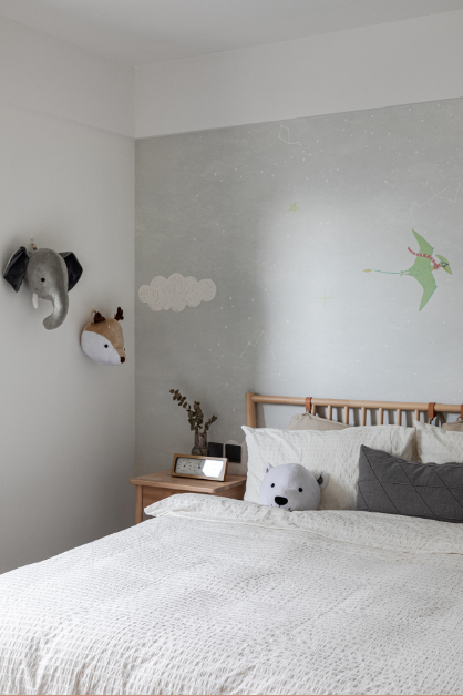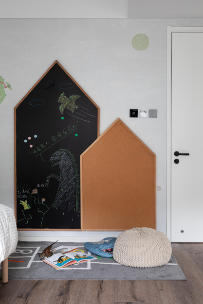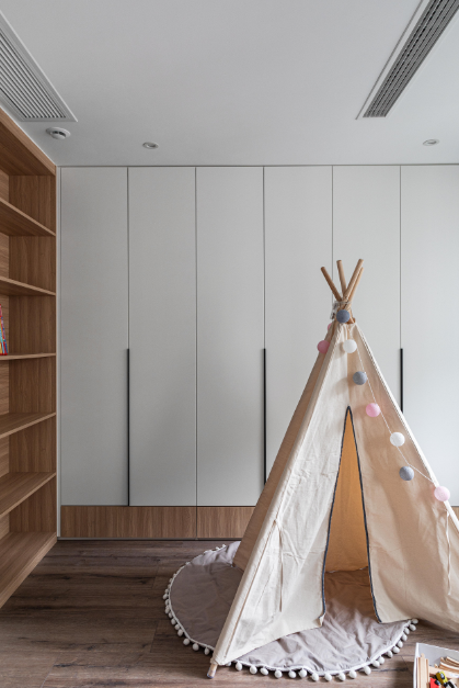 屋主想给孩子更多的休闲活动的空间,所以将原有的两个卧室合并成一个儿童房。屋主的宝宝叫布丁,年纪比较小,所以目前设计的是留给孩子更多空间玩耍,后期如果孩子有游乐区和学习区的需求可以再增加。