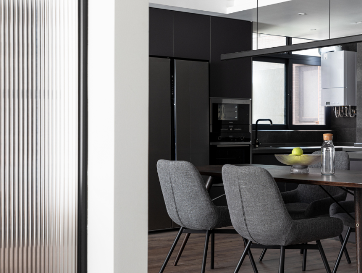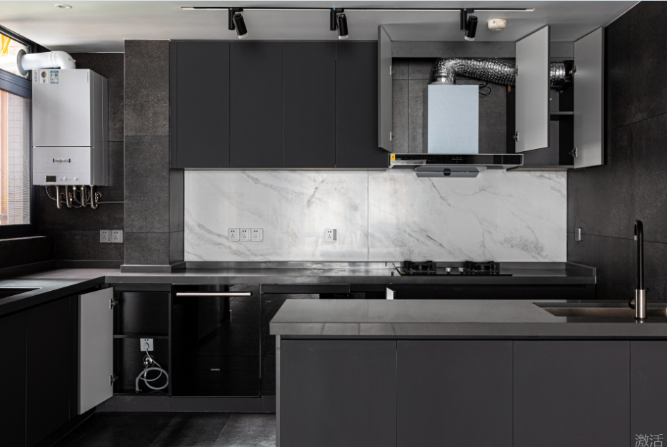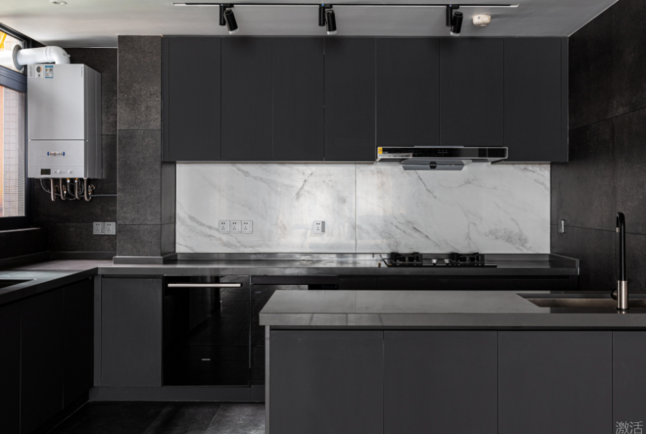 还将整个厨房的所有管道都隐藏于橱柜内部,这样整个天然气管道就不会显得太过突兀。厨房整体的色调选择深灰色,高级又耐脏,让整个空间瞬间提升了一个档次。