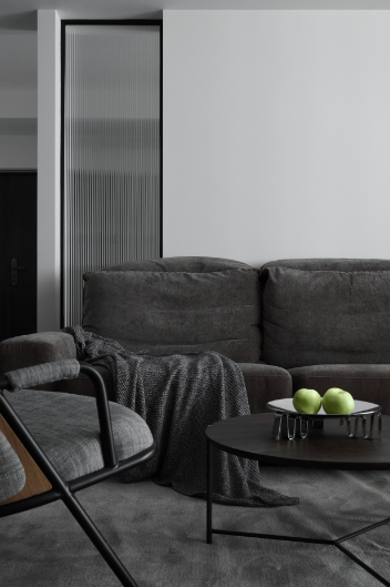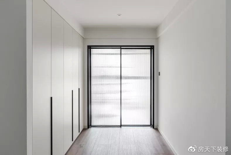 为了避免一进门就看到各种晾晒的衣物,设计师特意选用长虹极窄黑边框的推拉门,不仅能够避免尴尬,还不影响玄关处的采光。