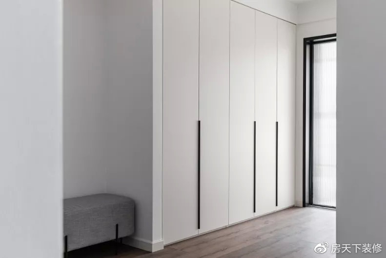 玄关左侧则设计了整墙的收纳柜,平时经常穿的衣服、日常穿搭都可以收纳其中。而且设计师特别贴心的设计了换鞋凳,方便屋主坐下来脱换鞋袜。屋主表示这个设计得到了很多来客的肯定。