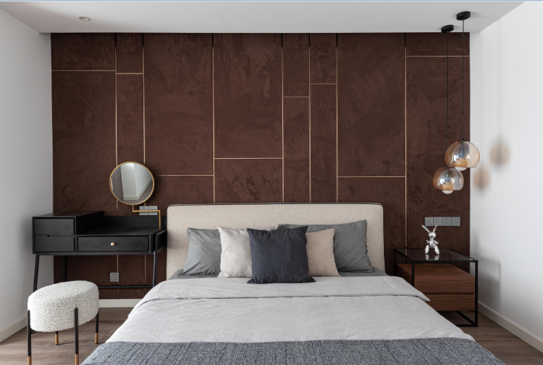主卧床头则采用了金属线条+硬包饰面作为装饰,提升了空间的品质感。