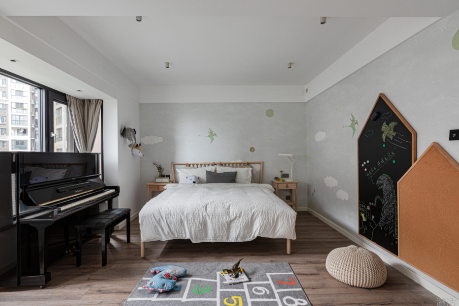 墙面设计增加了各种童真童趣的图案,让儿童房不会显得过于单调。同时设计师考虑到了后期孩子学习而预留了书桌与钢琴的摆放位置。
