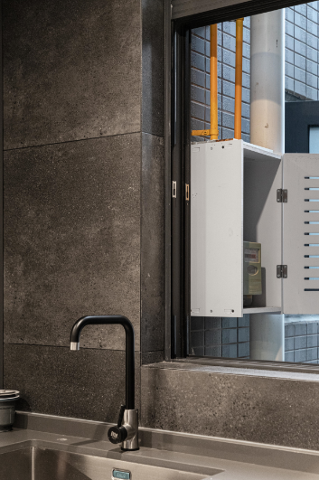 将冰箱内入,燃气表移至了厨房的窗外,并用PVC保护盒进行保护,使整体看上去更简洁大方。