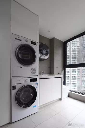 玄关连接处的生活阳台,可以放置一些日常洗衣用品,比如说洗衣机、烘干机、拖布池等,这样洗衣晾衣都可以在这个区域内完成,不会影响到客厅光线。