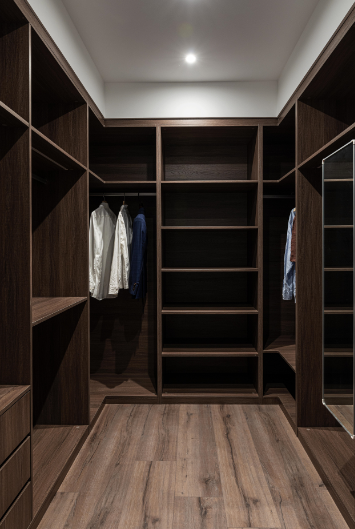 原四室户型中的鸡肋房间,改造成了现在的衣帽间,柜体与墙面采用了高低差收口。
