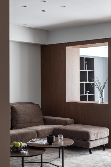 客厅与阳台之间有一处不可拆卸的横梁,非常影响美观,所以设计了木作隔断作为客厅与阳台区域的分区。有了隔断后,阳台也形成了一个半封闭式的空间,可以作为茶室偶尔会客,同时也可以作为小朋友玩耍的宽敞空间。