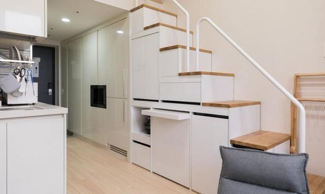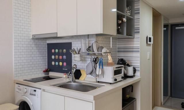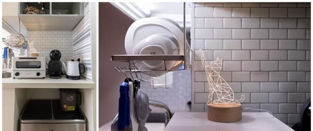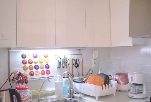 相比较儿子的公寓,女儿这儿的厨房稍微宽敞一些,东西也更丰富一些,台面上各种小电器,水槽周边墙面上有挂钩,台面上有沥水架,吊柜下面同样也有灯带,这下不用担心晚上洗菜看不清了。