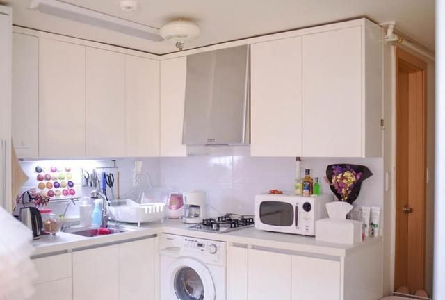 占地不到2㎡的厨房竟然还是转角橱柜,洗衣机也被塞进了灶台下面,收纳全都靠橱柜和吊柜,水槽上方悬挂带挂钩的沥水架,上面放碗碟,下面挂餐具刀具。