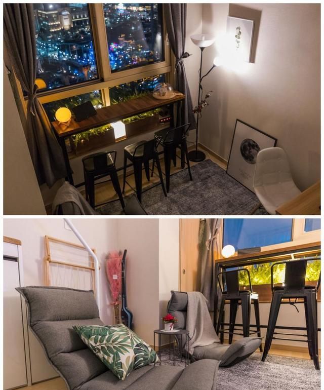 客厅有一面超大的窗户,视野超好,窗前设计了吧台桌,坐在这儿喝喝咖啡,工作聊天都能欣赏到窗外的美景。吧台桌下面还有小灯和花盆,可以起到间接照明的效果,看着就很高级。