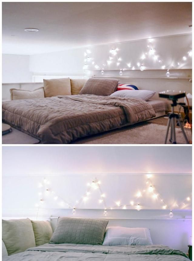 二楼卧室层高有限,同样也是只铺了床垫,床头挂些小彩灯,还挺有浪漫氛围的。