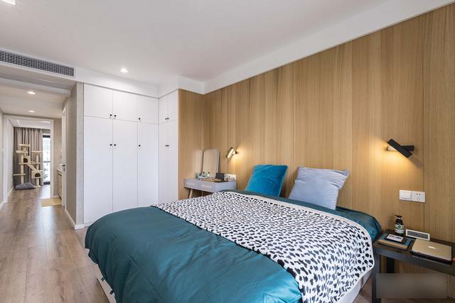 在卧室床头和楼梯之间的墙面一侧设计了一面镜子,起到了增大空间的效果。因为楼上卧室空间比较长,而且卧室只有一面窗户,空间的采光不是很好,因此镜子的设置也可以起到了提亮空间的作用。